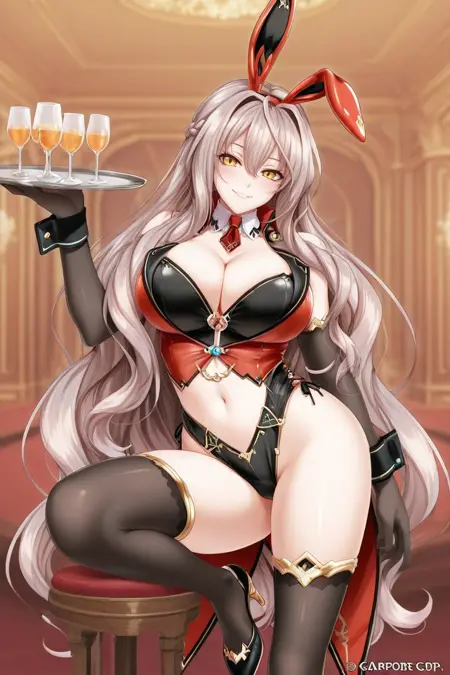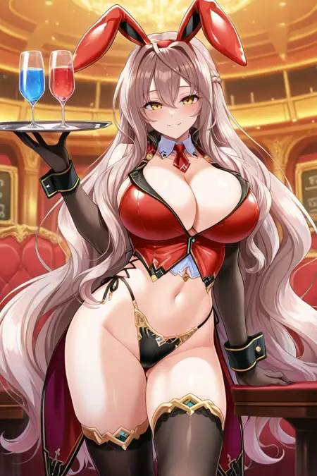 赤いバニー服、胸元の強調、フェイクバニー耳、黒いエルボーグローブ、黒いシンクタックス、露出したおへそ、赤いコートテイル、赤いネクタイ、白いカラー、黒い下着、ハイヒール