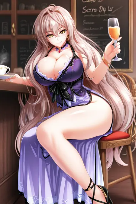 カジュアル衣装、ワンピース、紫のドレス、サイドスリット、黒いリボン、ノースリーブ、胸元の強調、ジュエリー、ブレスレット、チョーカー、黒いハイヒール