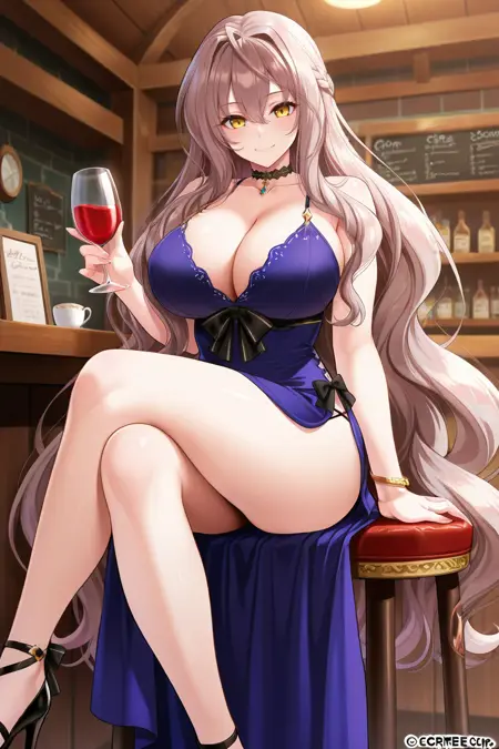 茶色の髪、非常に長い髪、ウェーブヘア、髪が目元を覆う、フランス編み、黄色い目、大きな胸