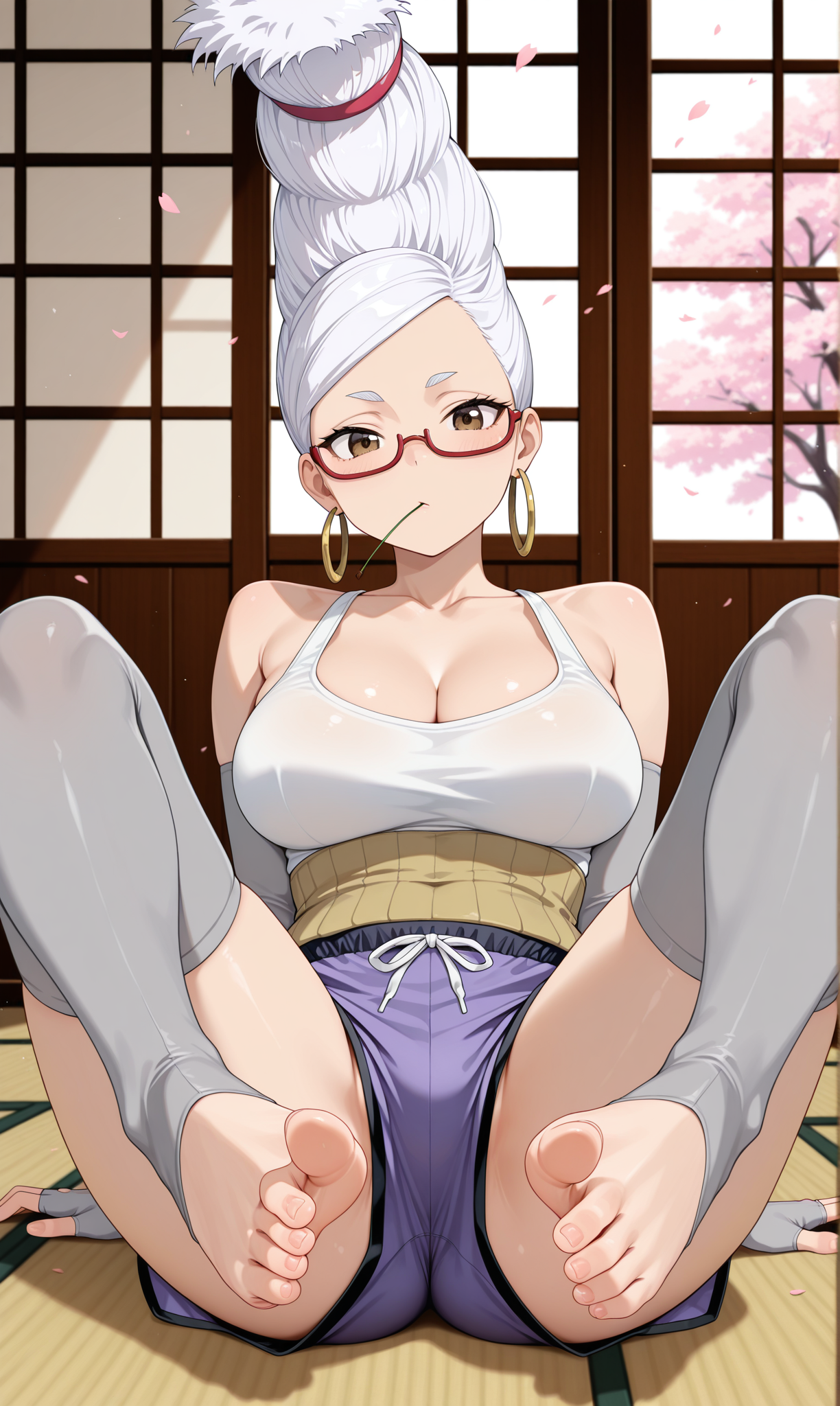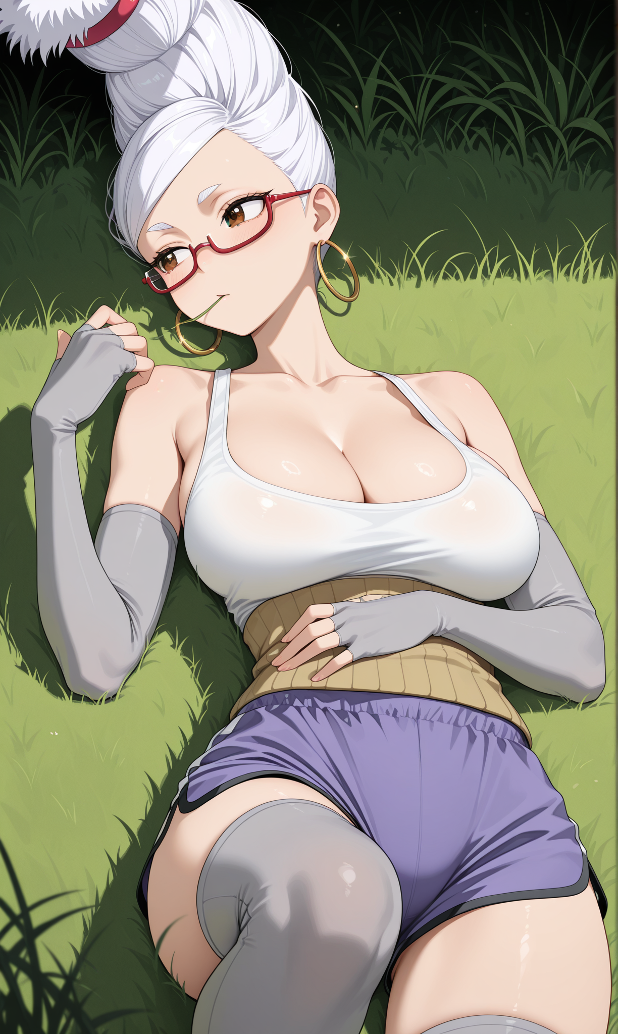白いタンクトップ、グレーの取り外し可能な袖、エルボーグローブ、フィンガーレスグローブ、紫のドルフィンショーツ、グレーの太ももハイ、胸元、鎖骨、黄色いハラマキ