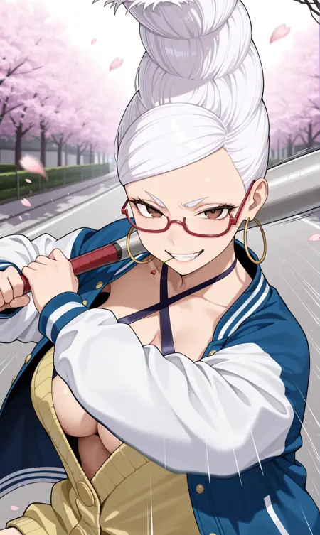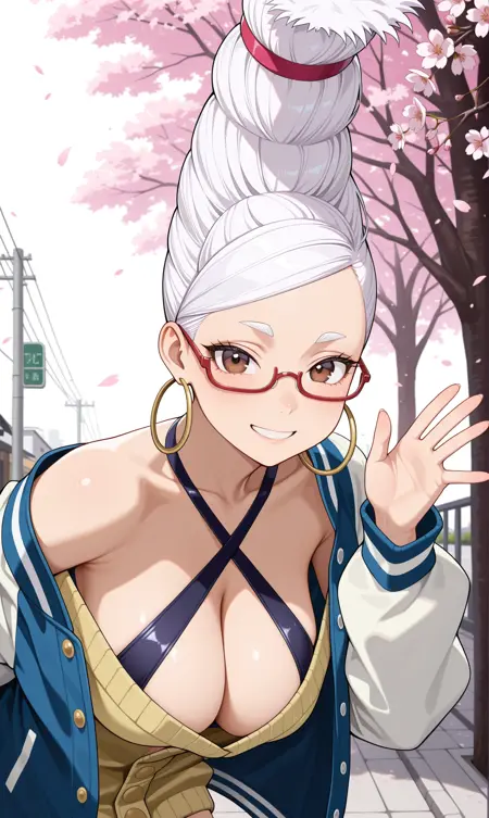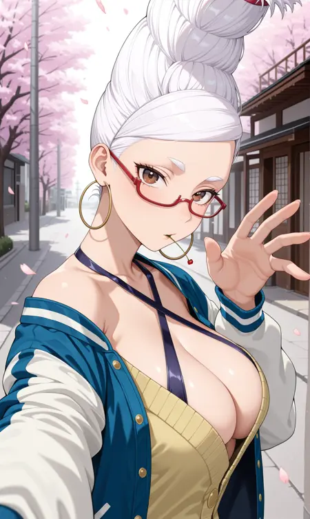浅瀬聖子、茶色の目、白い髪、ハチの巣ヘアスタイル、アンダーリム眼鏡、セミリムレス眼鏡、赤フレーム眼鏡、フープイヤリング