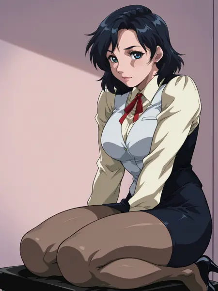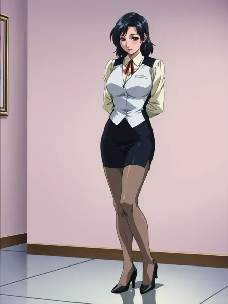노란색 칼라 셔츠, 은행 조끼, 빨간 넥티브, 파란색 연필 스커트, 팬티스톡, 하이힐
