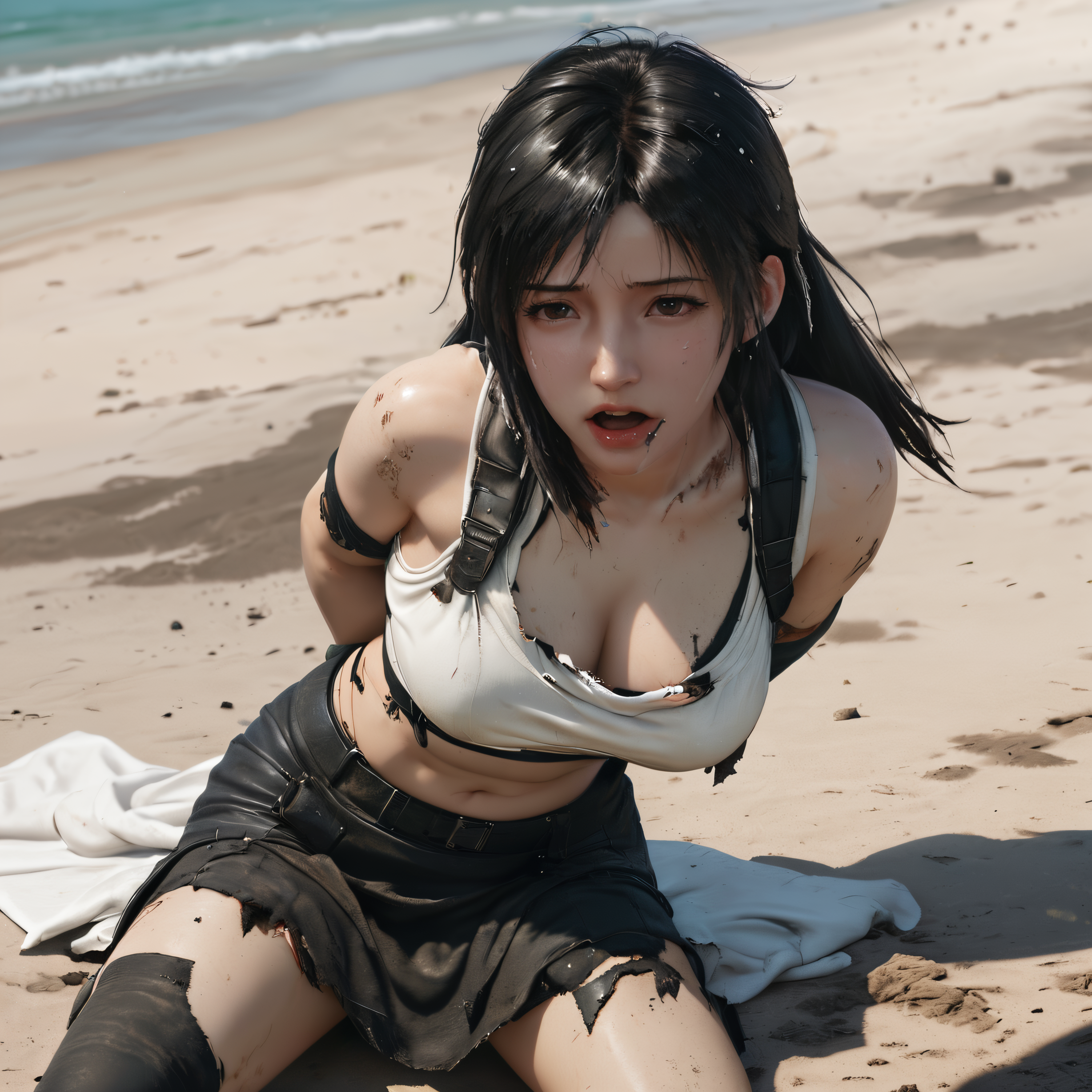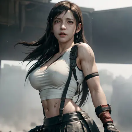 prompt: ff7tifa, white tank top, suspenders, elbow gloves