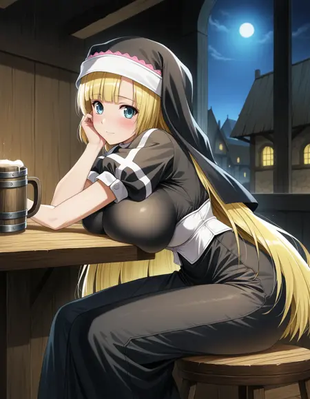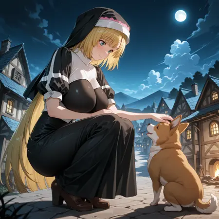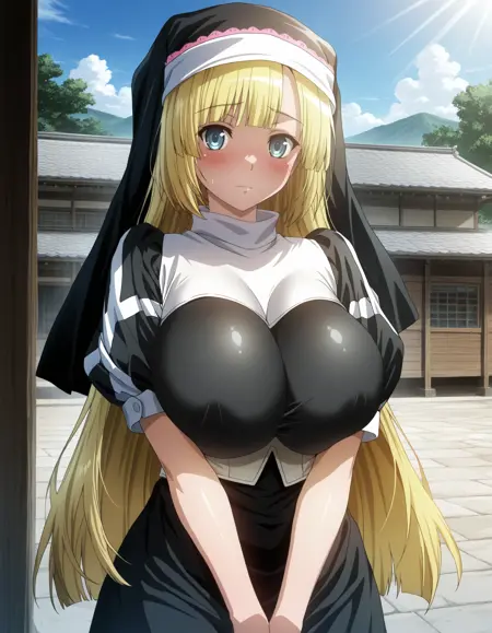 traditional nun, black dress, impossible dress, white corset, puffy short sleeves, long dress动漫截图风格: