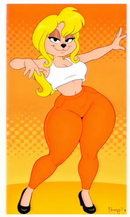 タグ: blanquita_pumby, 黄色い髪, 黒い目, 黒い鼻, 白いクロップトップ, オレンジのズボン, 黒いハイヒール