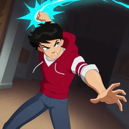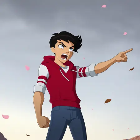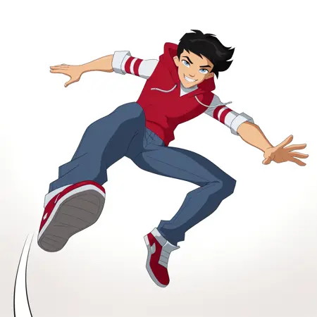 태그: 1남자, 남성 중심, Leo_Walker, 연한 파란 눈, 검은 머리, 단발, 흰 셔츠, 소매 말아올린, 빨간 후드 조끼, 청바지, 흰색 및 빨간 신발