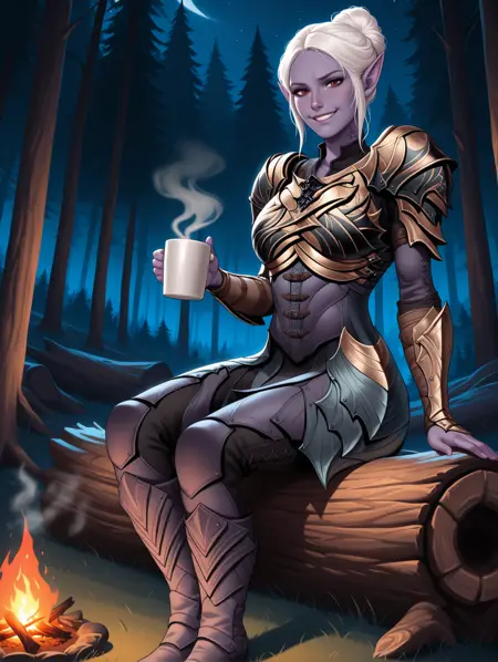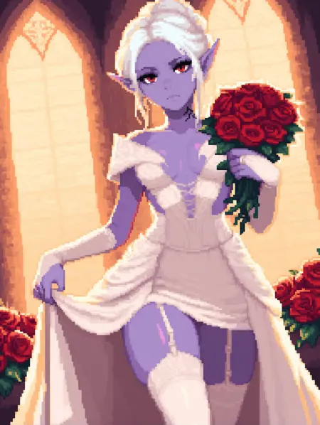 Appearance: mintharabg3, red eyes, purple skin, white hair, neck tattoo, spider web tattoo, pointy ears, single hair bun, elf, drow,