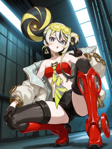 タグ(衣装):片肩出し、ホイール、二つ結び、頭にかける眼鏡、ゴールドトライアングルイヤリング、ゴールドチョーカー、白いジャケット、赤いバンドー、黄色いボウタイ、ゴールドアームレット、黒いハーフグローブ、黒いショートショーツ、黒い太ももハイソックス、赤いメカニカルブーツ、ガーターストラップ