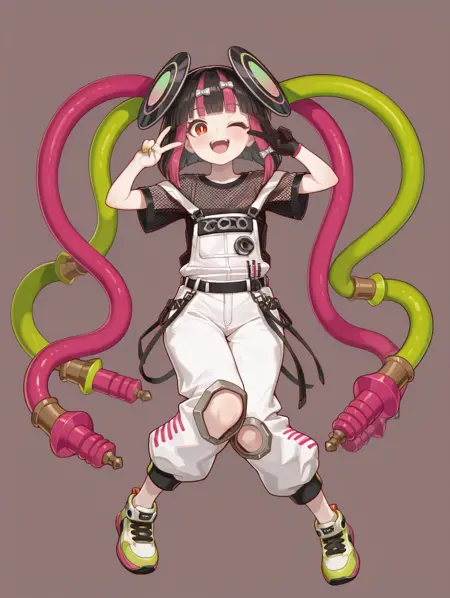 タグ(衣装):緑のネイル、透けたシャツ、髪のパイプ、髪のレコード、フィッシュネットシャツ、白いオーバーオール、片手の手袋、ストラップスリップ、スニーカー、裸足、膝の切り抜き