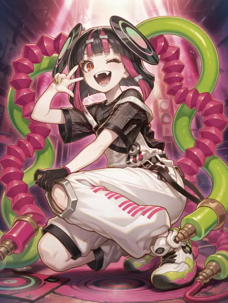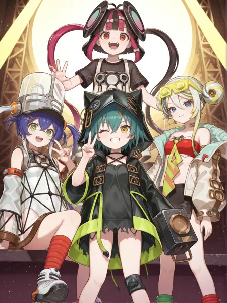 タグ(衣装):スピーカー、ジッパー、膝パッド、両手武器、透けた素材、黒いメカニカルブーツ、フードを被った状態、X型の髪飾り、黒いフーディー・ジャケット、黒いチョーカー、黒いカマソール、黒い腕装備、緑の靴下、メガホン