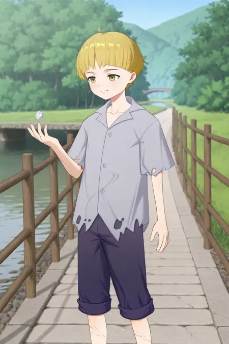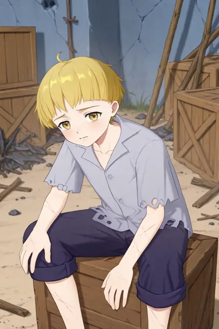 전신에 흉터, 찢어진 셔츠, 회색 셔츠, 파란 바지, 바지 말아올린 상태,
