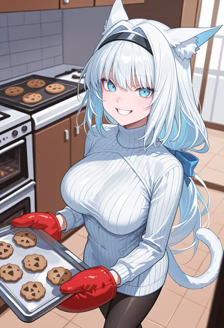 外观: cat tail, long hair, white hair, low ponytail, hair bow, blue bow, hairband, animal ears, animal ear fluff, blue eyes, large breasts