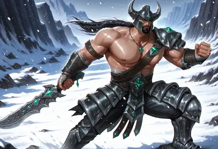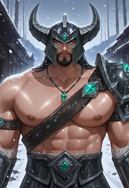 armor, horned helmet, single pauldron, shoulder belt, necklace, wraps, arm strap, arm guard, faulds, armored boots