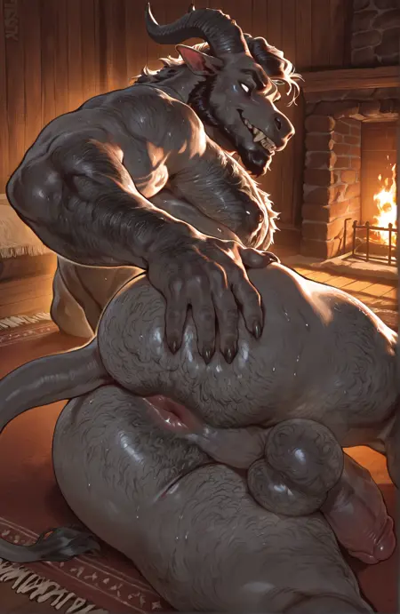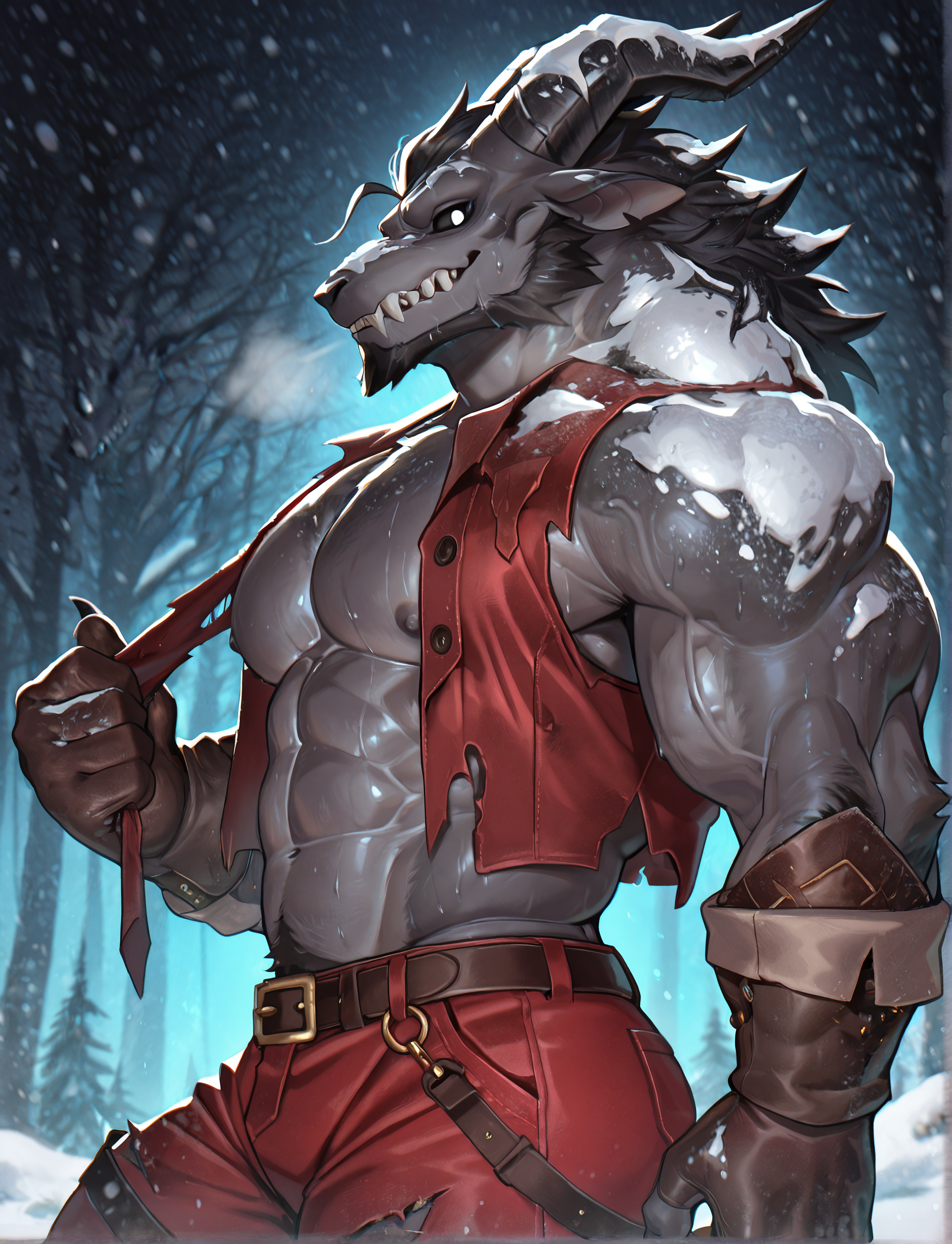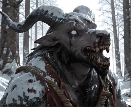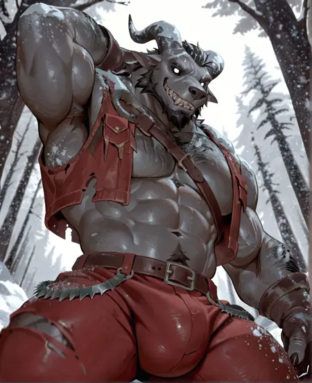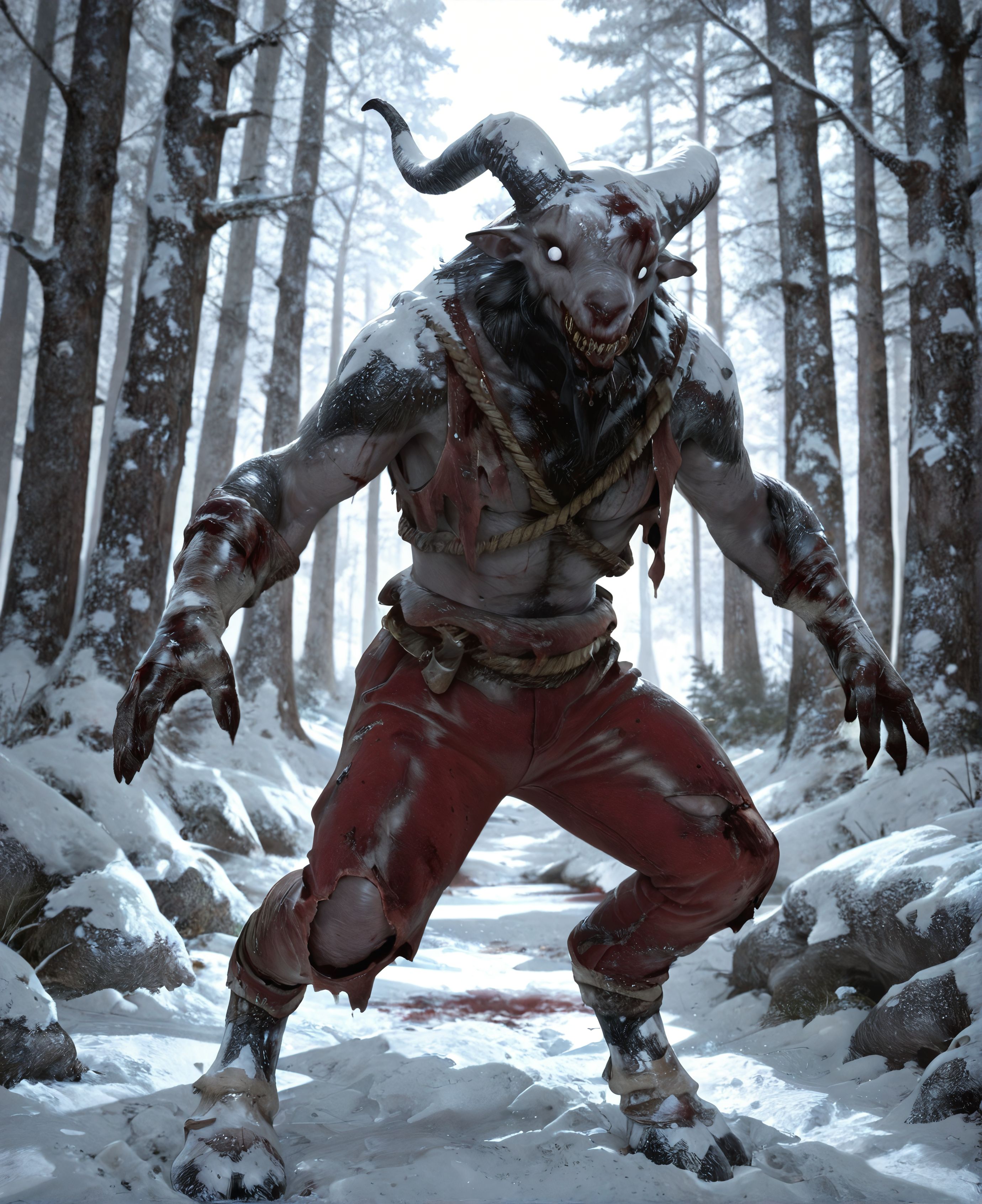 Tags: kr4mpu5, horns, blood, monster, grey skin, hair, fur, covered in snow, rope, vest, animal ears, ripped clothes, ragged clothes, gloves, claws, sharp teeth, beard, milky eyes, white eyes, hooves, digitigrade, red pants, ...