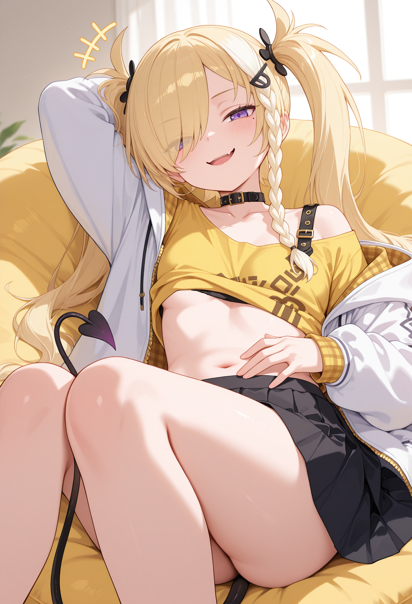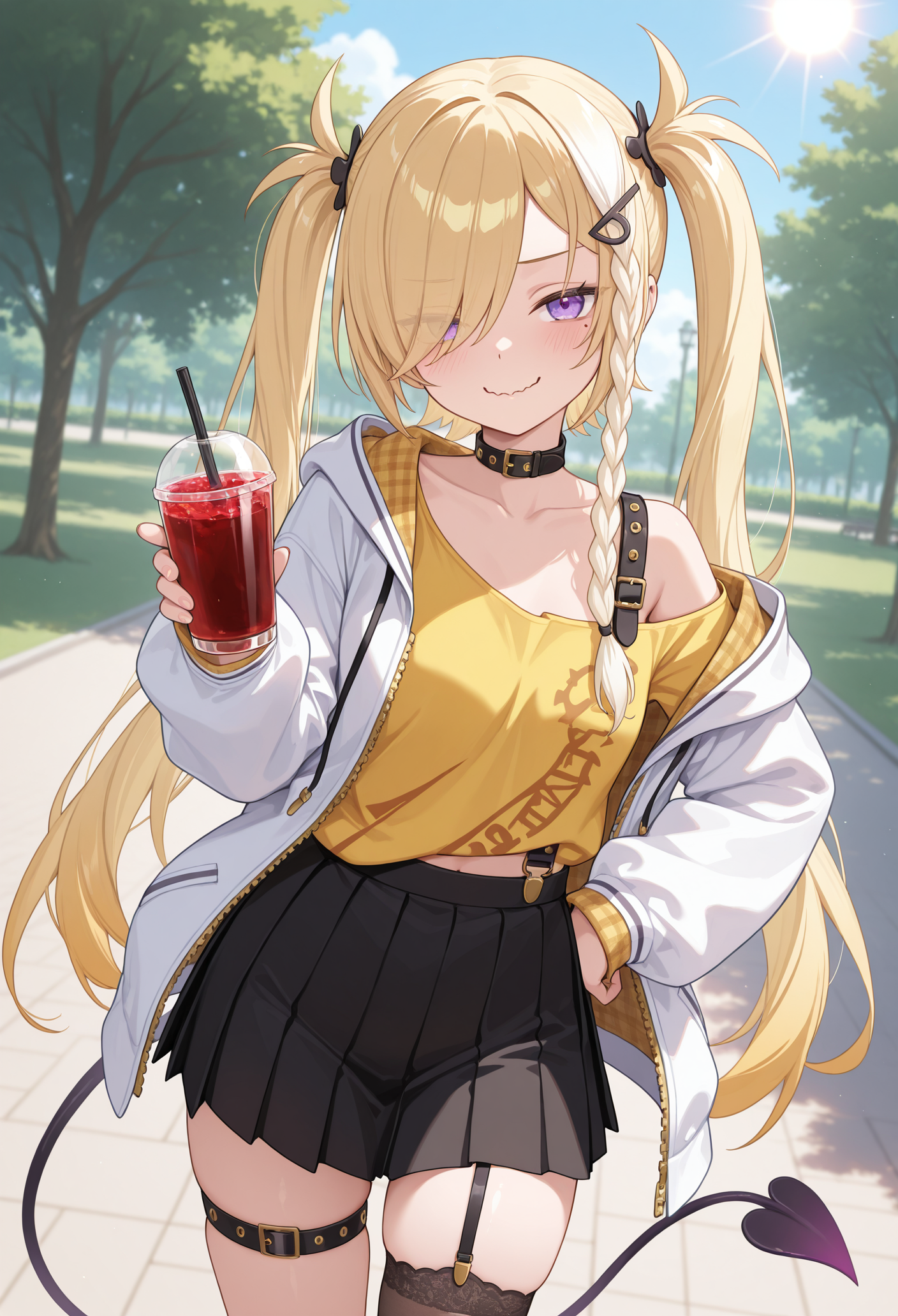 purple eyes,mole under eye,long hair,white hair,blonde hair,twintails,hair over one eye,multicolored hair,braid,demon tail,