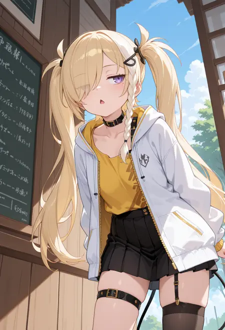 hair ornament,choker,yellow shirt,midriff peek,collarbone,white jacket,black skirt,pleated skirt,thighhighs,single thighhigh,thigh strap,garter straps,single suspenders,checkered,