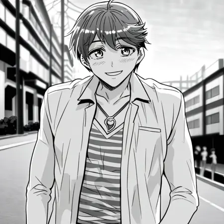 单色:(( lora:hi7o\_8n4ou:1 , hi7o_8n4ou, 清澈眼睛,友善眼睛,短发,凌乱刘海,可爱男性,美丽肌肤,有魅力男性,))