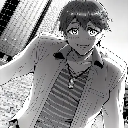 彩色:(( lora:hi7o\_8n4ou:1 , hi7o_8n4ou, 琥珀色眼睛,清澈眼睛,友善眼睛,棕色短发,凌乱刘海,可爱男性,美丽肌肤,有魅力男性,))