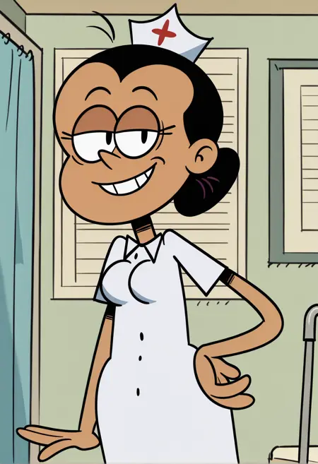 니켈로디언의 애니메이션 시리즈 The Loud HouseThe Casagrandes에 등장하는 마리아 산티아고. 4가지 다양한 옷차림(일상복, 흰색 간호사 복장, 파란색 간호사 복장, 핑크 수영복)을 갖추고 있습니다.