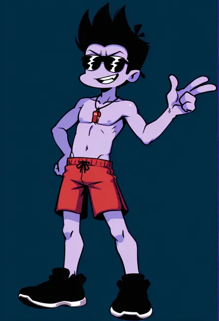BBrotherFNF, 1boy, purple skin, black hair with horn-shaped spikes, shirtless, red swimming shorts, massive black shoes, black shades, red whistle around neck, red glowing eyes, black sclera,