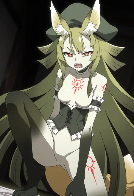 緑色の髪, 非常に長い髪, 赤い目, 黄色い瞳, 白い瞳, モンスターガール, グラデーション髪, 暗緑色の髪, 色付きの肌, 青白い肌, 動物の耳, 狐の耳, 尾,