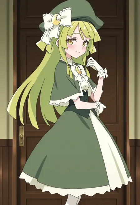 帽子, 帽子のリボン, 緑色の頭部装飾, 緑色のキャップレット, 緑色のドレス, リボン付きシャツ, 白いリボン, 三日月, コルセット, 白いスカート, 白い手袋, 白いパンティーストッキング,