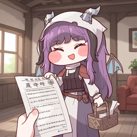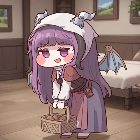 태그: 1소녀, 보라색 머리카락, 보라색 눈, 날개, 긴 머리카락, 뿔, 드래곤 날개, 긴 소매, 머리 수건, 치마, 지토메, 치비, 뺨 붉은 스티커, 바구니, 들고 있음