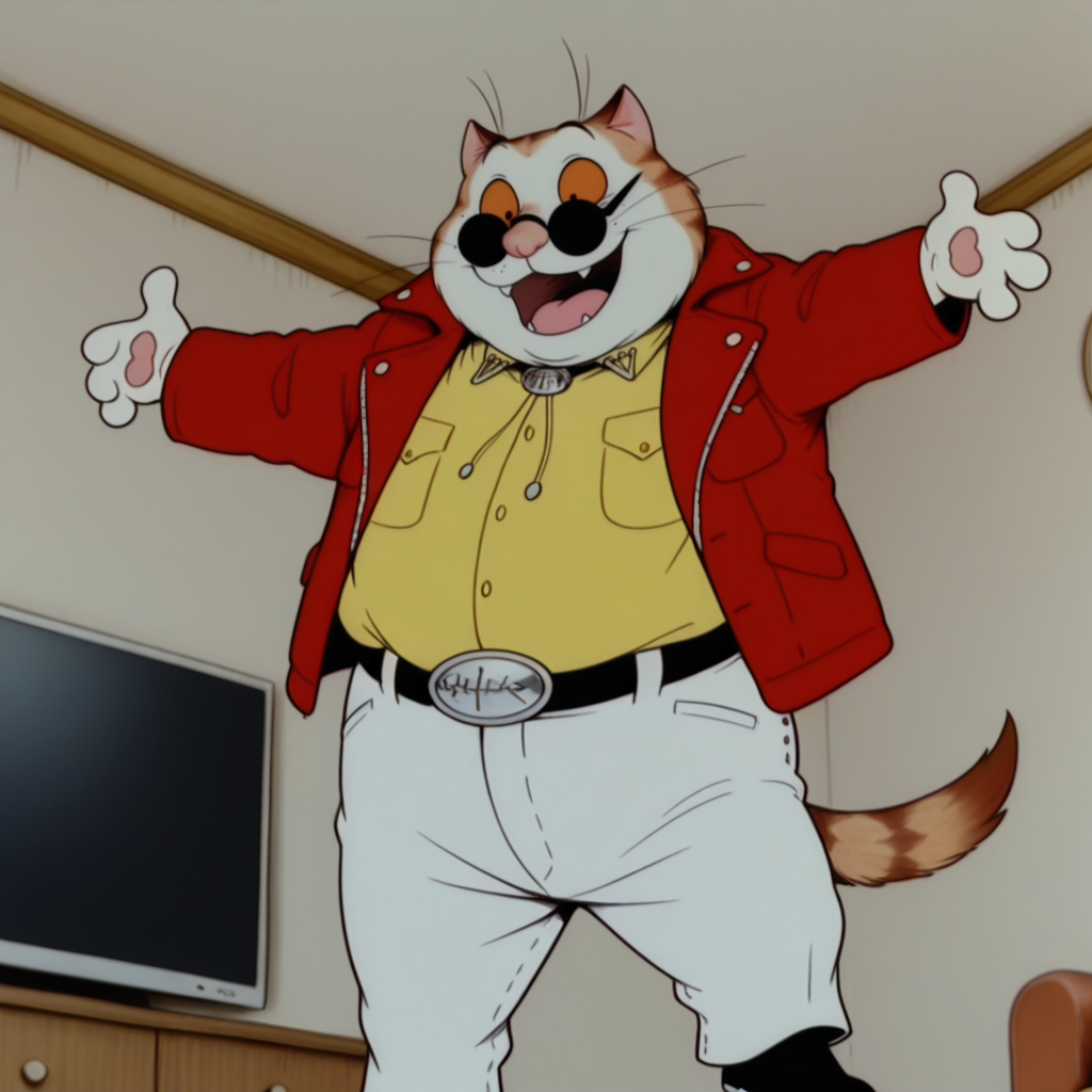 | トレーニングワード | 1boy, male, furry male, cat, solo, brown fur, striped fur, two-tone fur, orange sclera, black eyes, whiskers, pink nose, short ears, fangs, pawpads, dipstick tail, fat, plumpコピーしました! black glasses, red jacket, yellow shirt, buttons, black belt, silver buckle, white pants, black shoesコピーしました! orange shirt, long sleeves, puffy sleeves, gold necklace, red sash, green pantsコピーしました! black glasses, silver jacket, long sleeves, collar, gold necklace, black belt, silver pantsコピーしました! |