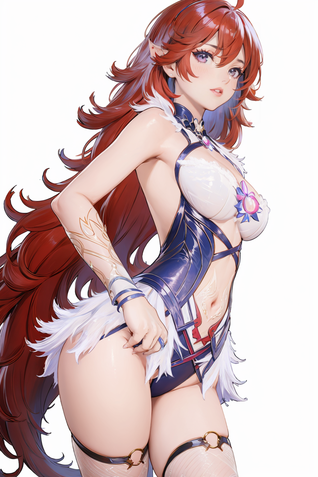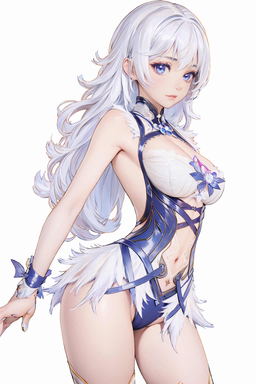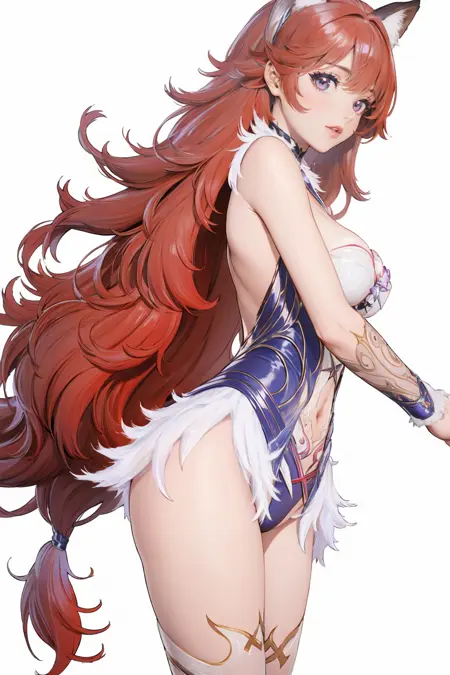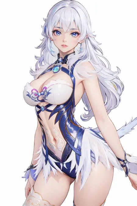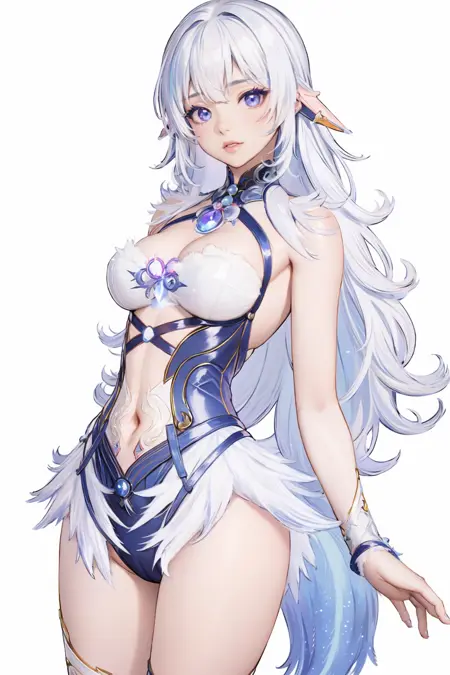 トリガー単語(Trigger word)****:Yin Ziping,1girl,solo,breasts,navel,backless outfit,blue leotard,cleavage,crescent,fur trim,leotard,see-through,tail,thighhighs,