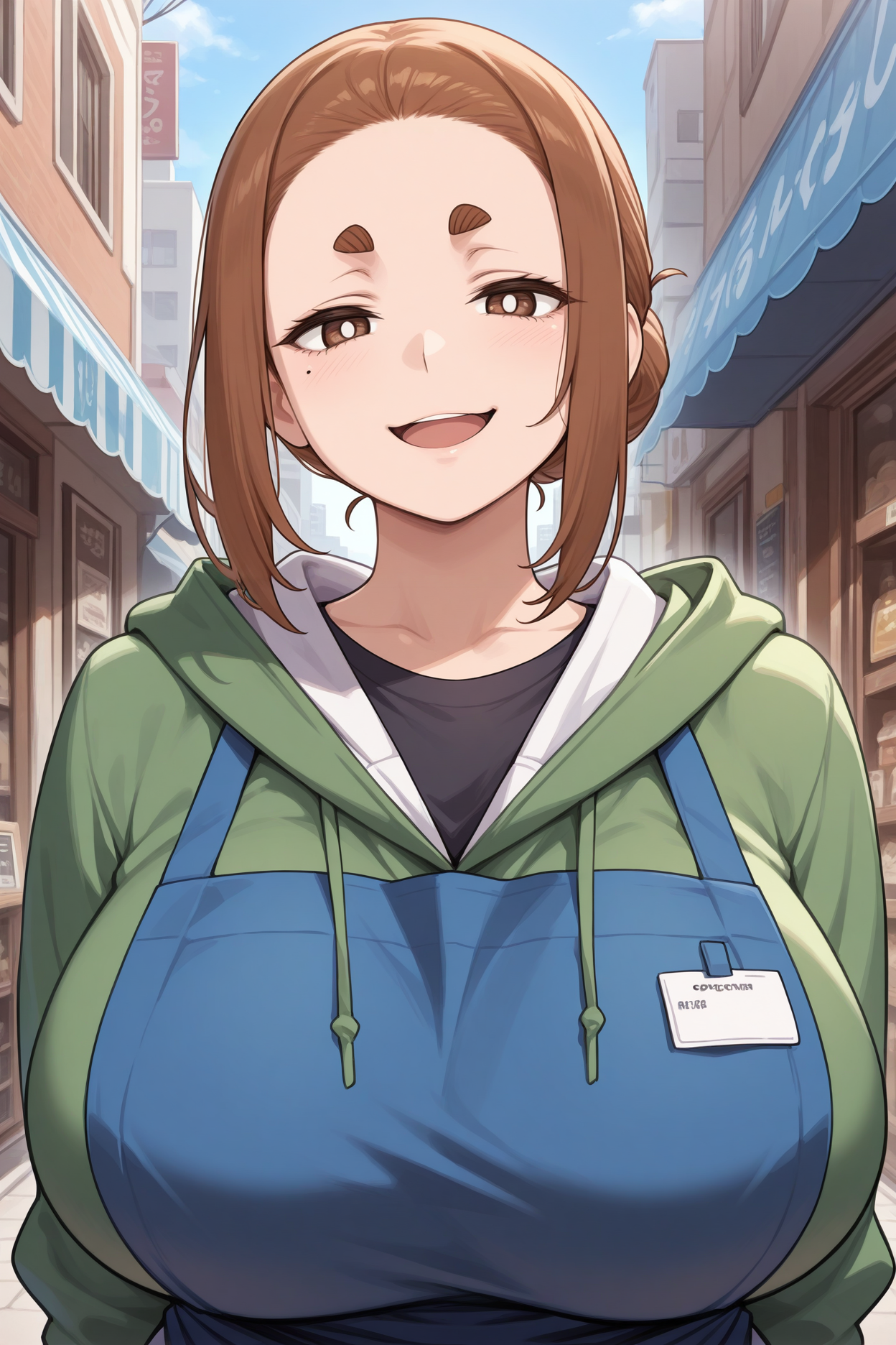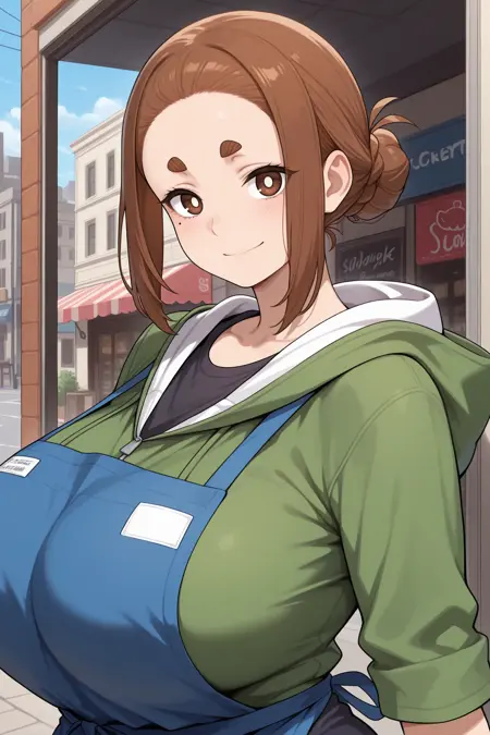 그녀의 전형적인 외모를 원하면 "녹색 후드티, 파란색 앞치마, 검은색 티셔츠, 청바지"를 추가하세요.