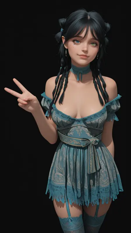 green-blue choker, lace choker, choker ribbon, green-blue dress, off-shoulder dress, bare shoulders, short sleeves, low-cut, cleavage, green-blue fringe, lace fringe, embroidered dress, tied waist sash, patterned waist sash, green-blue waist sash, lacy dress hem, short dress, garters, green-blue garters, white lace garters, green-blue garter straps, green-blue thighhighs, lace thighhighs