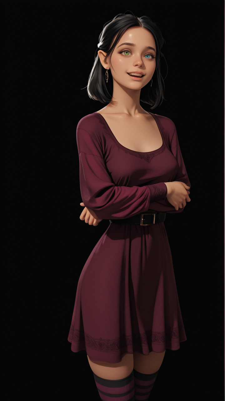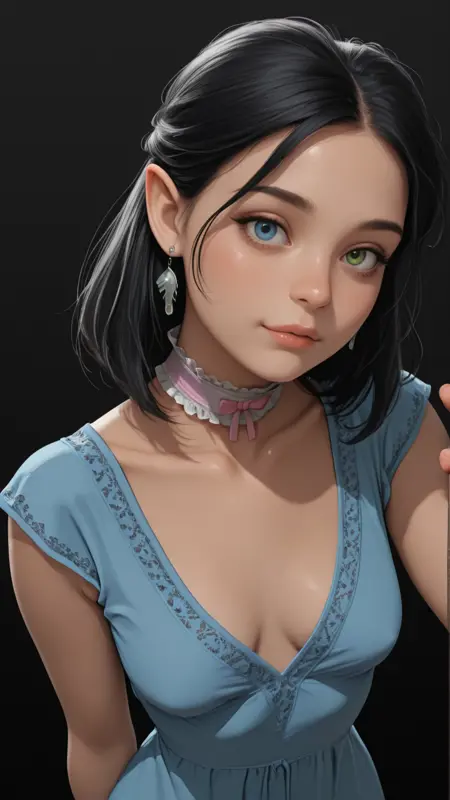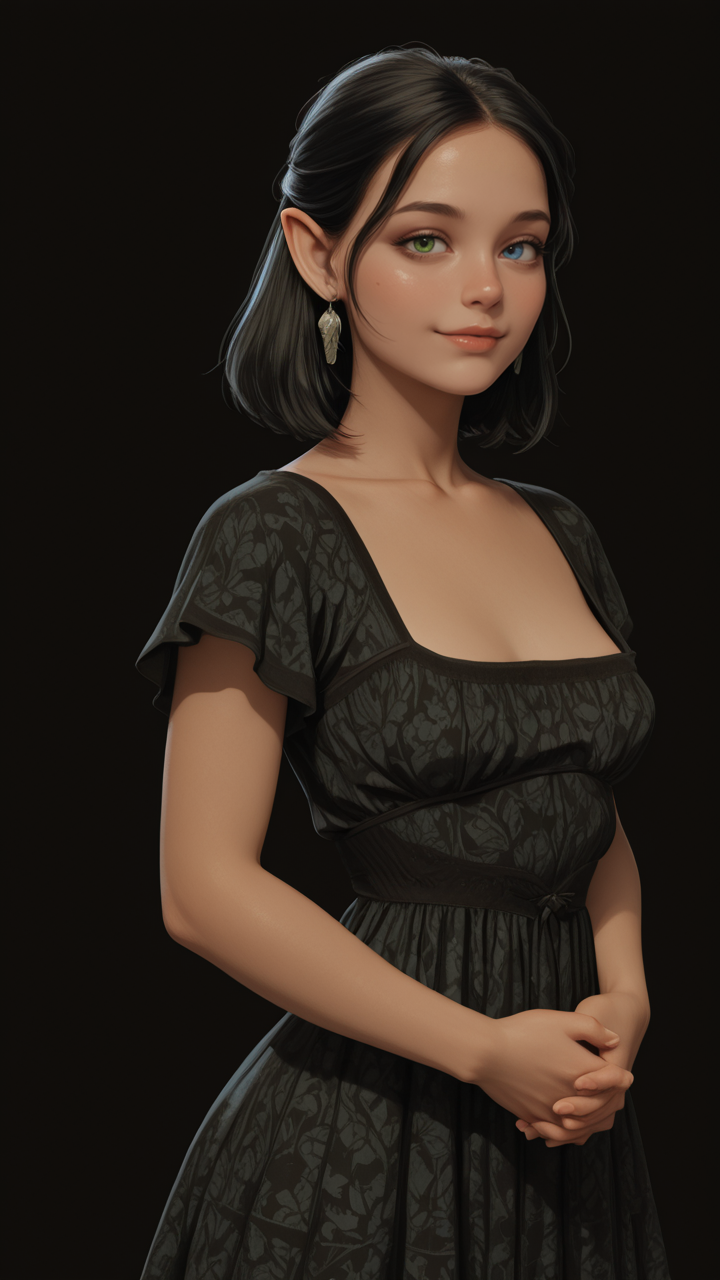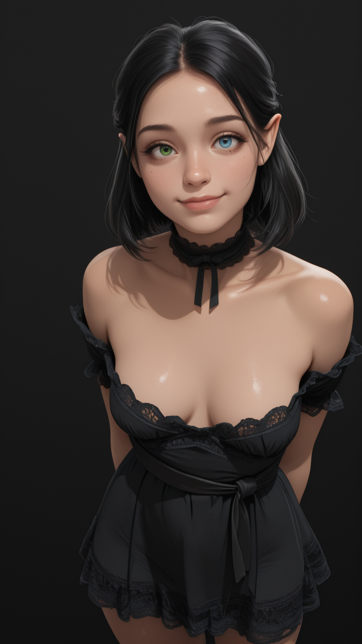 lia_impchron_def, black hair, heterochromia, right blue eye, left green eye, pointy ears, lips, earrings