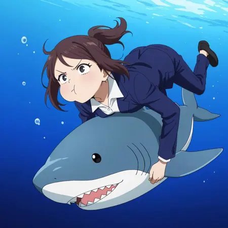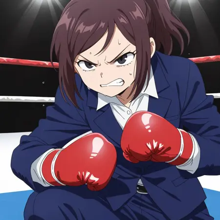 1girl, 갈색 머리, 말머리, 파란 정장, 파란 바지, 검은 눈, 팔찌