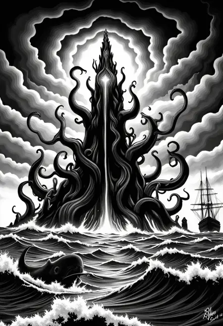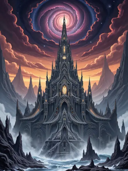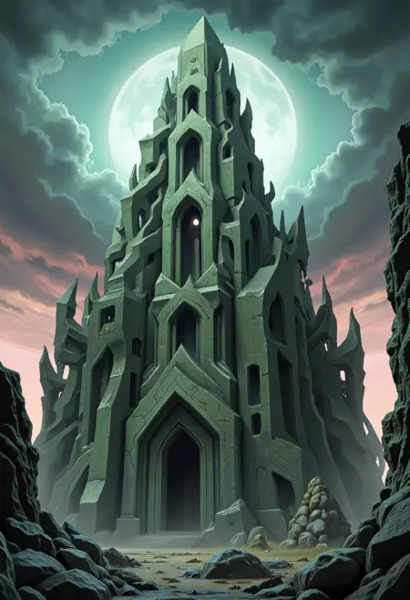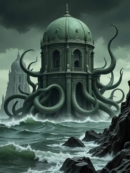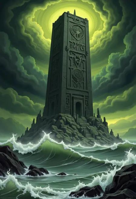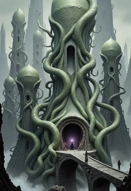 V1.0 better fits the popular cultural stereotype of a 'Cthulhu Castle/Temple' but deviates from R'lyeh's Non-Euclidean geometry. It looks more like a cultist spire tower with tentacle pattern. Therefore, I created V1.1 to align more closely with R'lyeh's Non-Euclidean spirit. It is more abstract and feels less like a man-made castle.