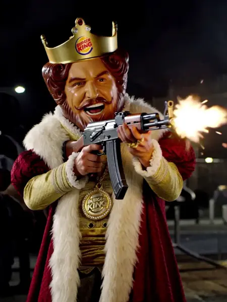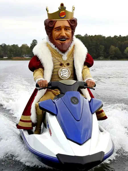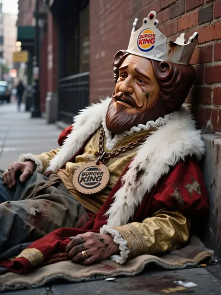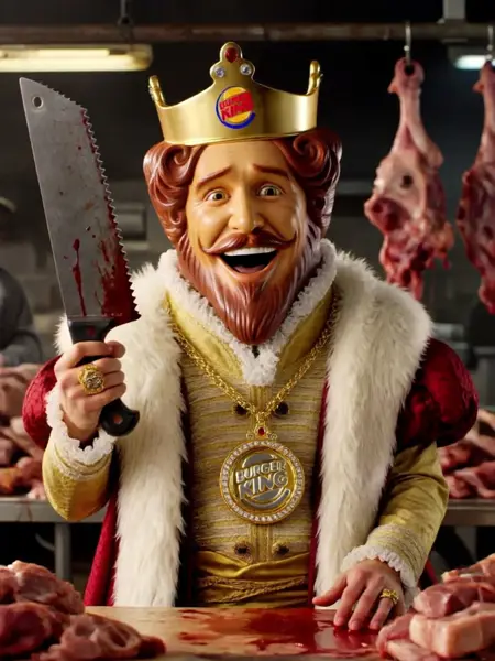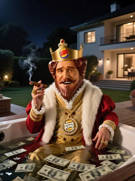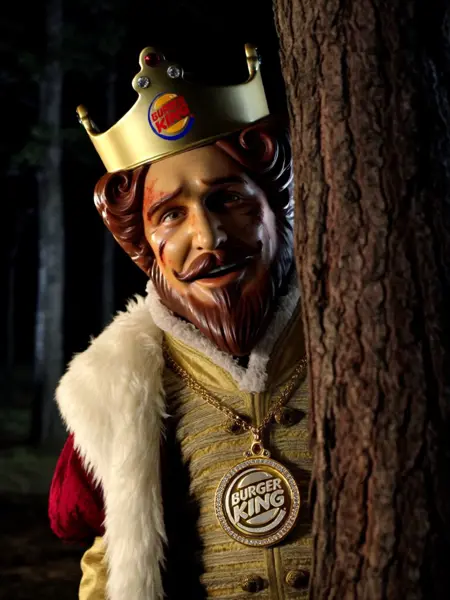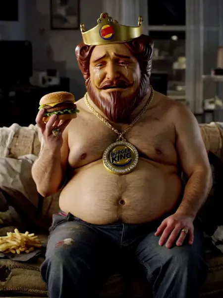 追加トリガー: 赤と金のローブを着用し、肩には白い毛皮のストールを掛け、頭にはバーガーキングのロゴが入った金の冠をかぶっており、金のネックレスには金とダイヤモンドでできたバーガーキングのロゴが付いたメダリオンが下がっている、ひげと口ひげ、