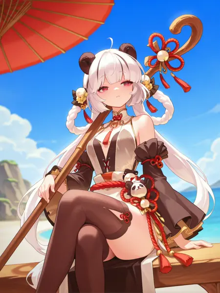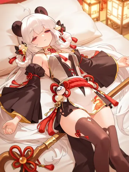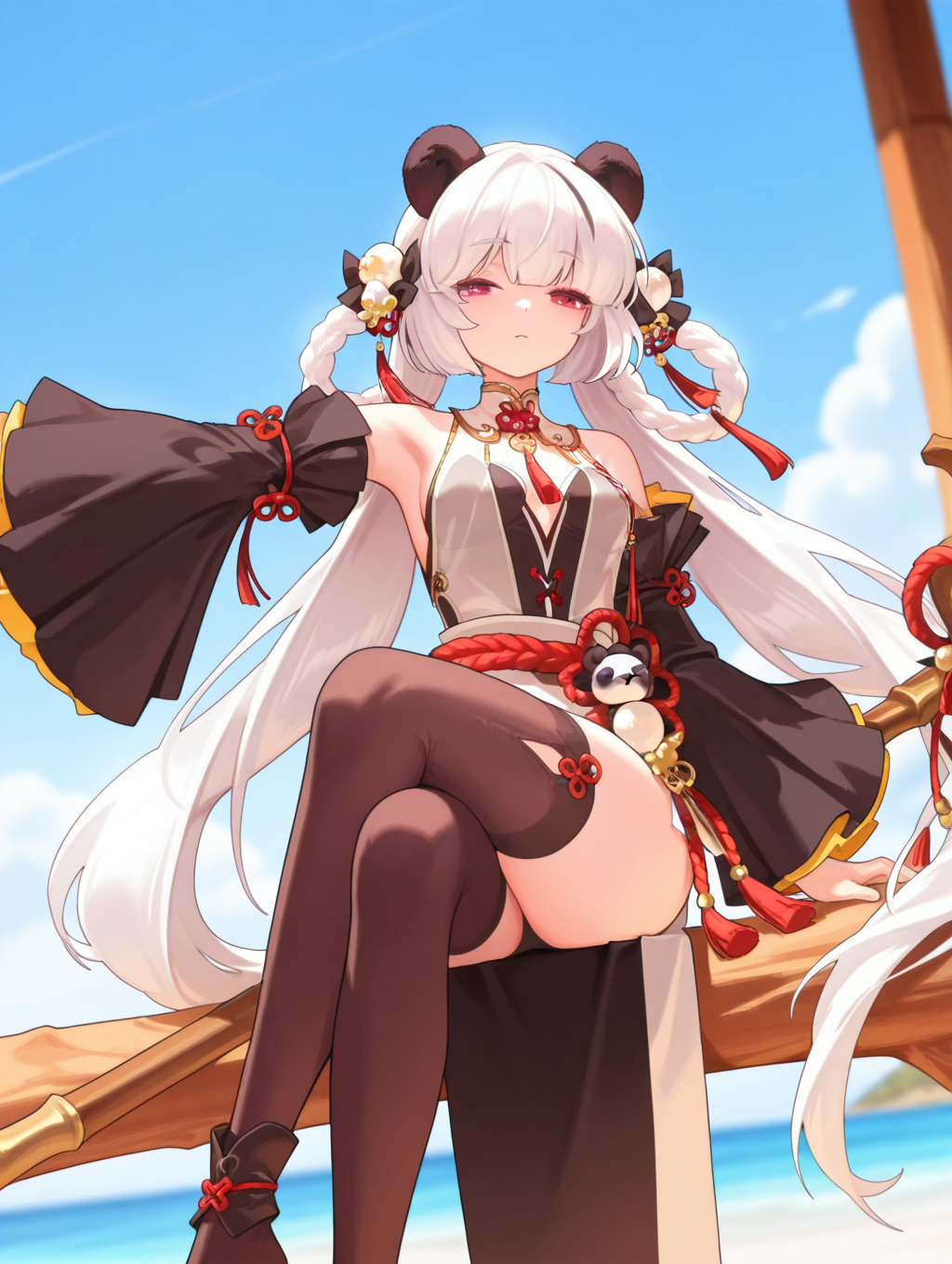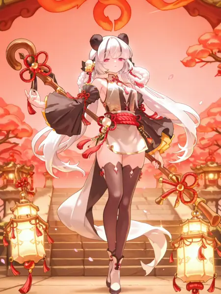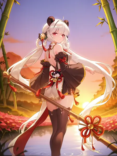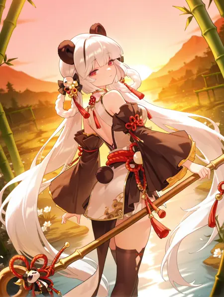 xiaoman, 1girl, solo, long hair, white hair, red eyes, dress, thighhighs, hair ornament, ribbon, animal ears, panda ears, polearm, staff, tassel, frills, wide sleeves, long sleeves, detached sleeves, shimenawa, flower knot, twin braids, panda, narrowed eyes,