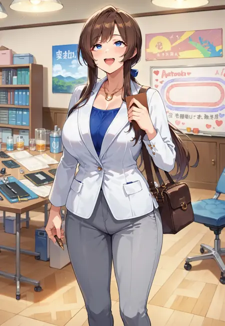 blue blouse, white jacket, horseshoe necklace, gray pants, brown bag, black shoes,
