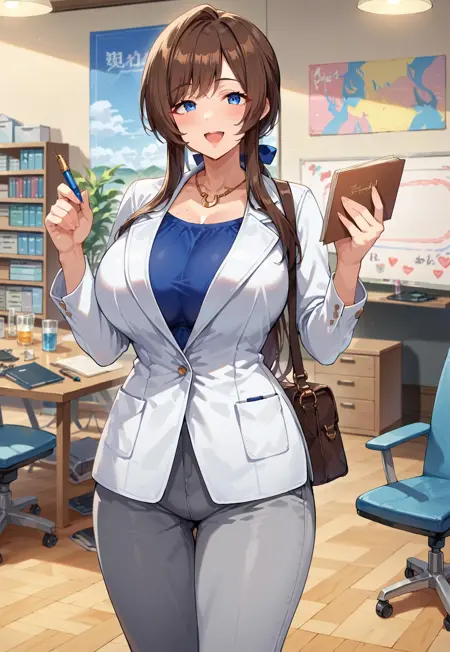 reporter_Otonashi, brown hair, blue eyes, long hair, low ponytail, blue ribbon, bangs,