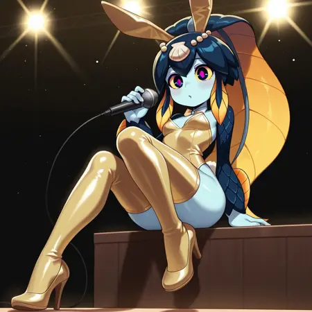 プロンプト: minette, blue skin, fish girl, apron, thighhighs, shoes