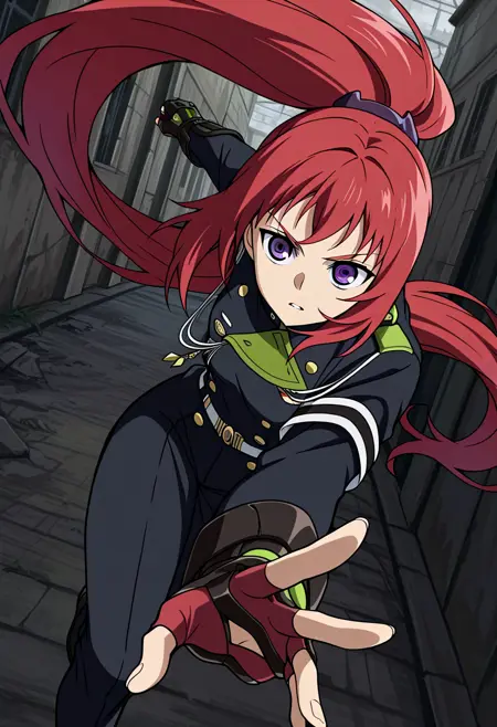 触发词为:1girl, mito jujo, vampire slayer uniform, red hair, purple eyes, ponytail