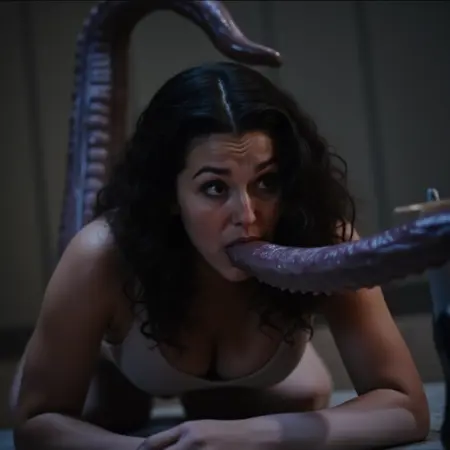 t3nt4cl3 네 발로 엎드린 벌거벗은 여자와 문어 괴물이 성관계를 하고 있다. 흰색 반투명한 점액이 웅덩이처럼 퍼져 있고, 여자는 쾌감에 신음하고 있다. 어두운 나무 바닥에는 오각형이 그려져 있고 배경에는 홀이 있다.