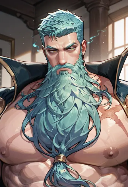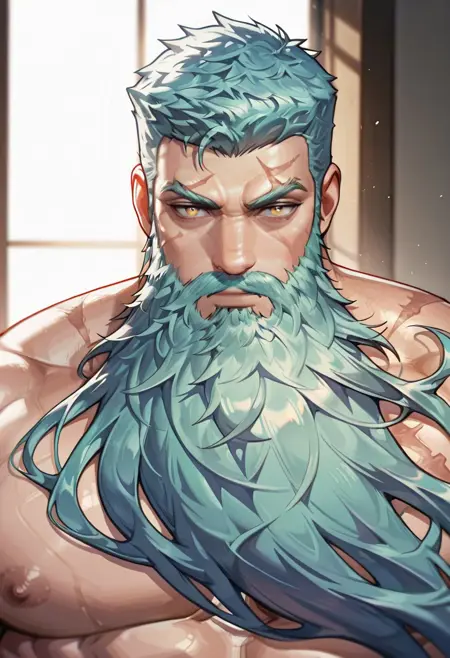 Prompt:lut0n, manly, Yellow eyes, blue hair, coat, Golden rope, aqua hair, facial hair, scar, beard, mustache,