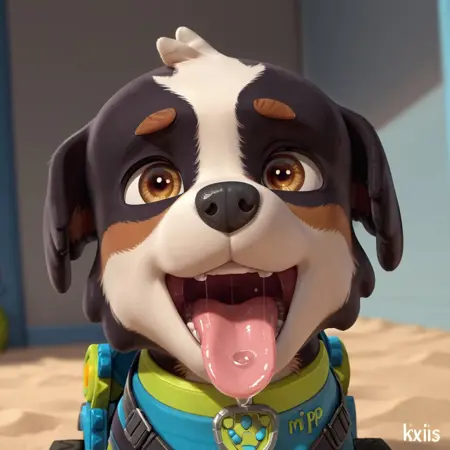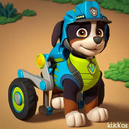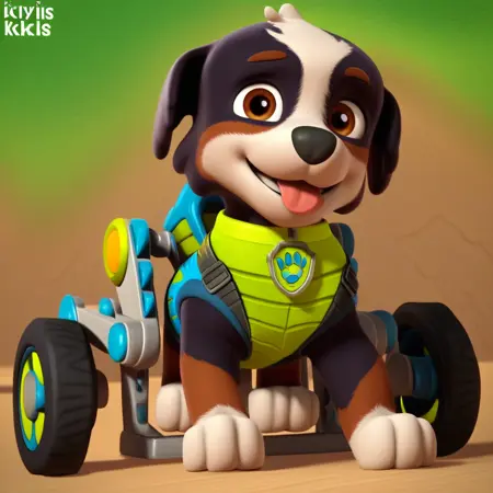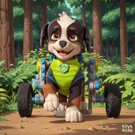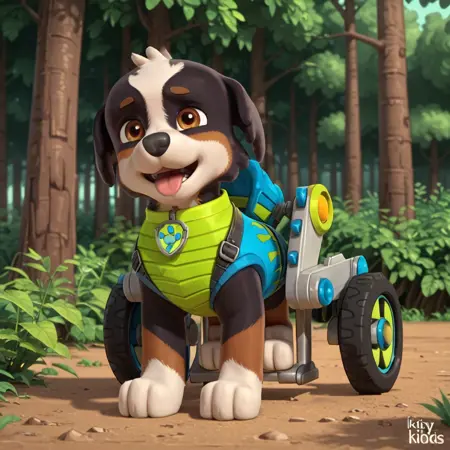 dog, Burmese mountain dog, black and white fur, brown eyes, brown eyebrows, black nose, dog ears, blue helmet, green and blue vest, dog wheelchair,