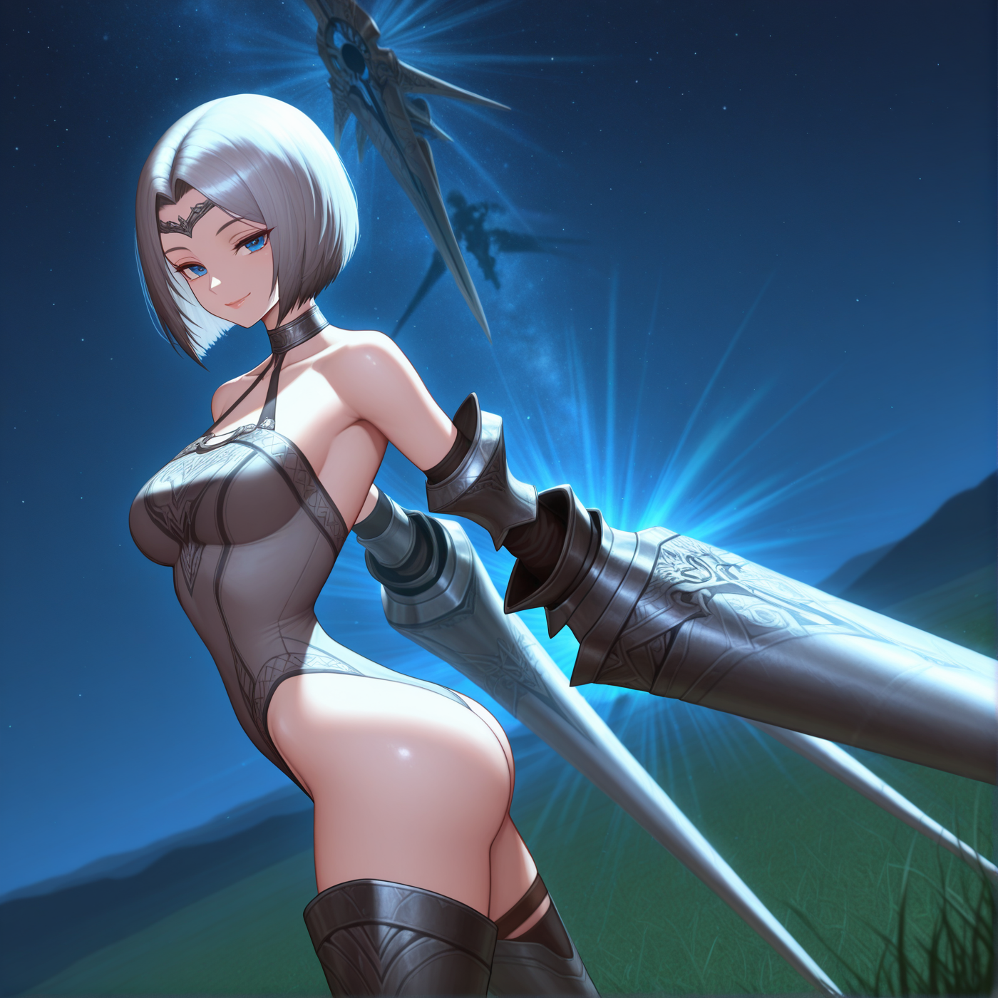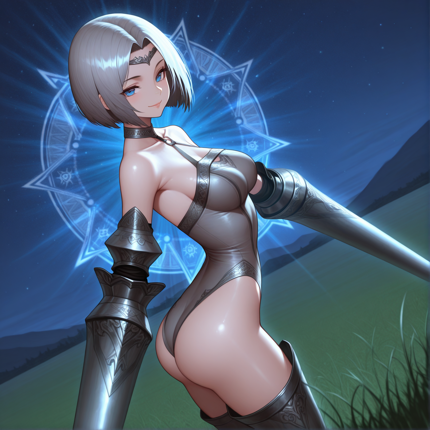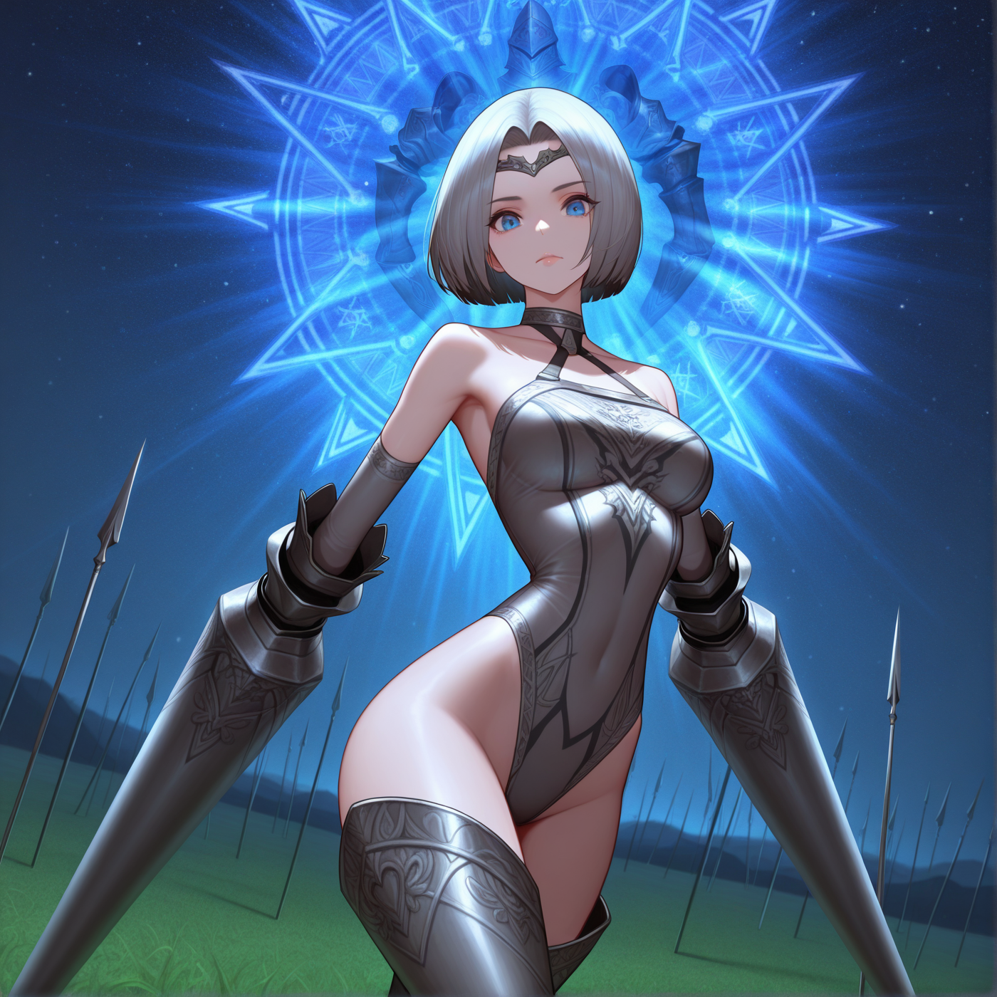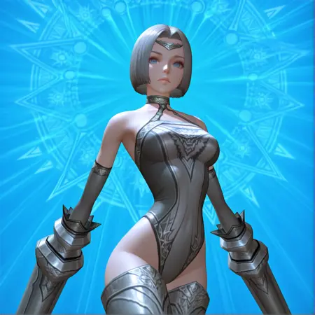 衣装:輪冠、灰色のレオタード、ブーツ、太ももブーツ、ハルターネック、ティアラ、手甲、肘手袋、肩出し、鎖骨、翼