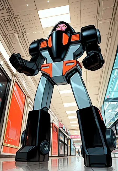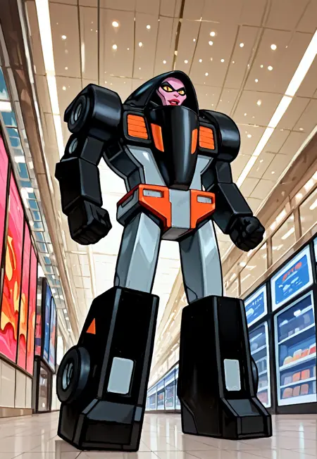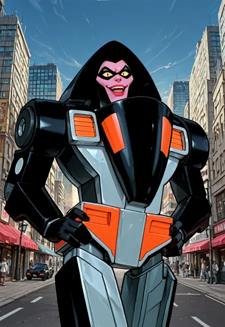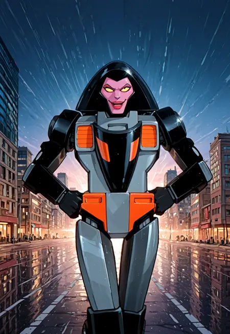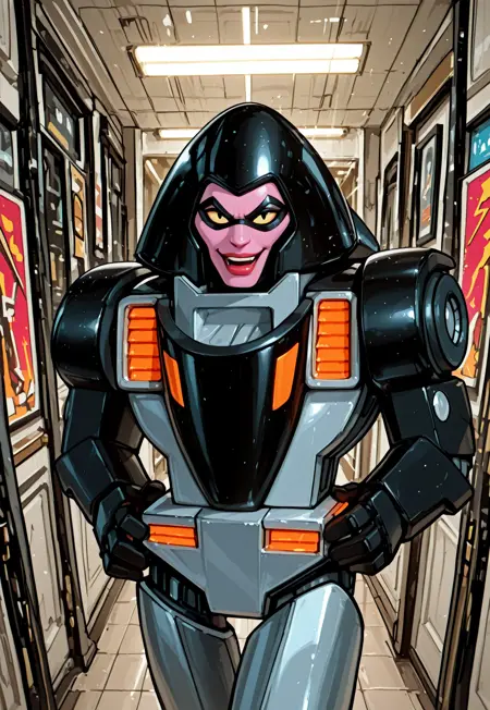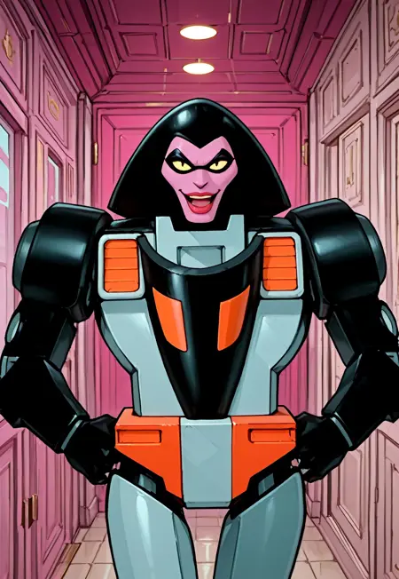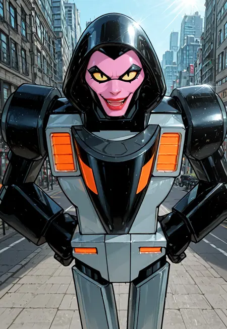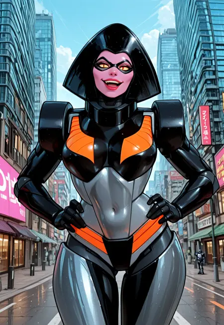 Crasher_Bot、ロボット、黒とシルバーのロボット、ドミノマスク、オレンジ色の細部、女性、ピンク色の顔、赤い唇、黄色の虹彩、黒い瞳孔、オレンジ色の排気口、黒い腕、黒い胸板、黒いヘルメット