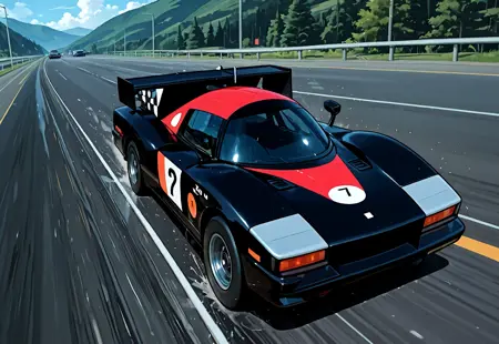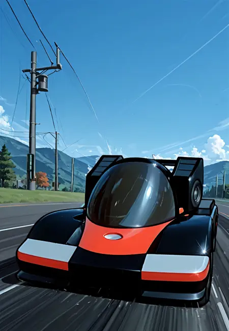 Crasher_Vehicle、黒い自動車、黒い車、黒いレーシングカー、グレーのウィンドシールド、グレーのヘッドライト、グレーのホイール、赤いフード、赤いサイドストライプ、オレンジ色の細部、白い細部