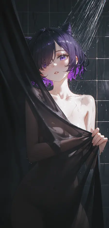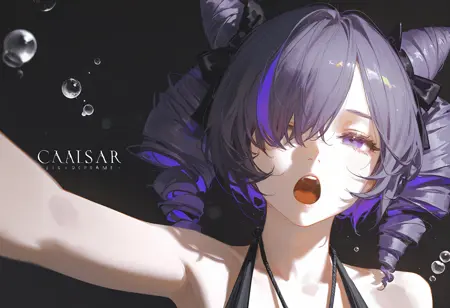 Tags标签标签: cone hair bun,hair over one eye,multicolored hair,purple eyes,purple hair,short hair,two-tone hair,