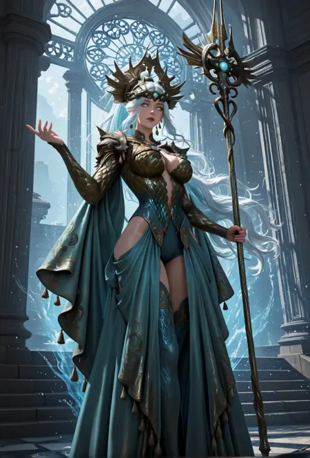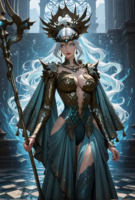 루사르카, 아름다운 여자, 우아하고 왕실 같은, 신성한 분위기, 하얀 피부, 완벽한 얼굴, 성숙한 여성, 파란 눈, 빛나는 눈, 속눈썹, 두꺼운 입술, 붉은 입술, 비정상적으로 긴 머리, 파도치는 머리, 은색 머리, 흰 머리, 화려한 금관, 날카로운 모양의 왕관, 보석 중심 장식, 조개 모티프 왕관, 왕실 보석, 보석 목걸이, 화려한 초크