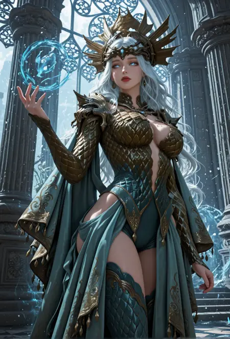 금색 갑옷, 비늘 갑옷, 금속성 가슴판, 가슴 노출 디자인, 큰 가슴, 갑옷 비늘 소매, 화려한 어깨 보호대, 흐르는 망토, 청록색 망토, 긴 망토, 자수된 망토, 금색 자수, 털끝 장식, 아쿠아 블루 원단, 실크 같은 원단, 계단형 치마, 슬릿 드레스, 허벅지 슬릿, 우아한 주름, 정교한 밑단 무늬, 두꺼운 허벅지, 넓은 엉덩이, 가는 허리, 파란색 화려한 허벅지 스타킹