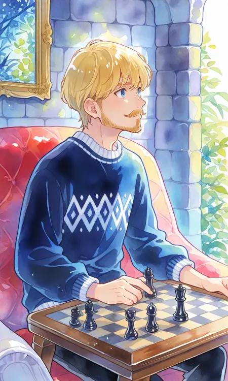 1boy,blonde hair,short hair,beard,moustache,blue eyes,blue sweater,white-trimmed sweater,pants